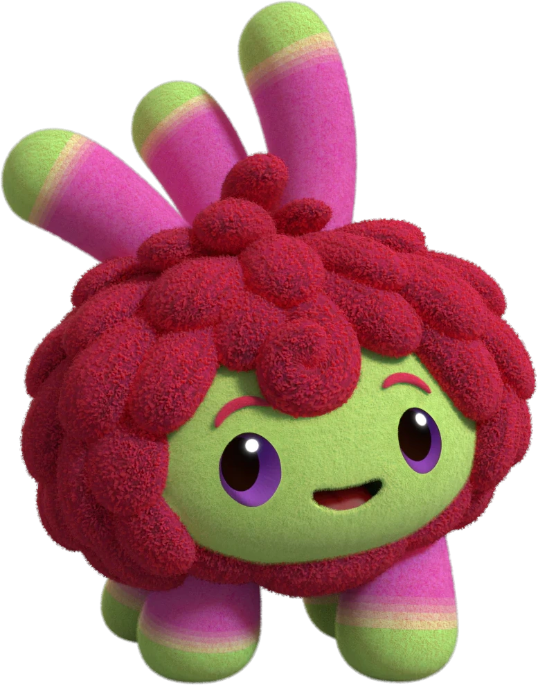 Otis has a fuzzy red body, green face and purple eyes. He has seven magenta tentacles with green edges: three large ones on his head, and four tiny ones as feet.